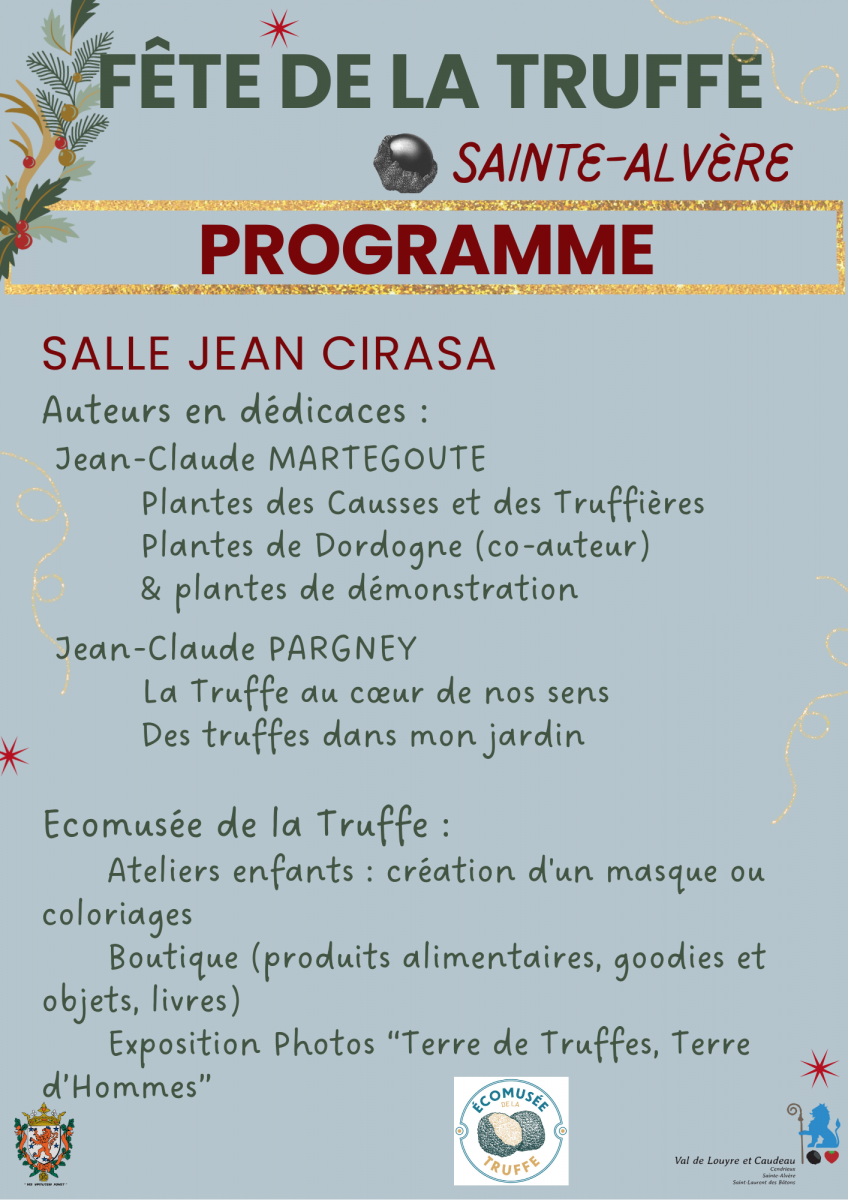 En plus du traditionnel marché aux truffes à 10h, vous retrouverez des pépiniéristes et exposants de matériel agricole, et des auteurs venus pour l'occasion. L'Ecomusée de la Truffe sera également présent avec une exposition photos inédite, des ateliers pour enfants et des produits issus de leur boutique.