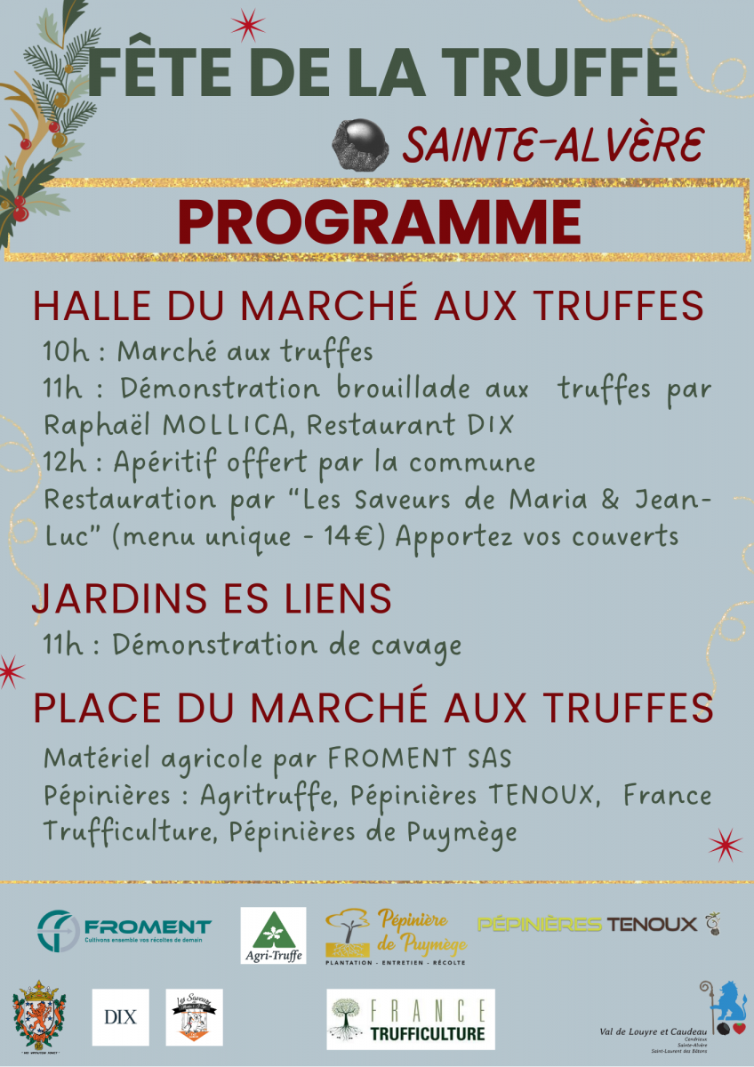 Démonstration de cavage aux jardins ès liens à 11h, démonstration culinaire (brouillade aux truffes) par le Chef MOLLICA du Dix Restaurant à 11h30 sous la Halle, apéritif offert par la Commune à 12h.