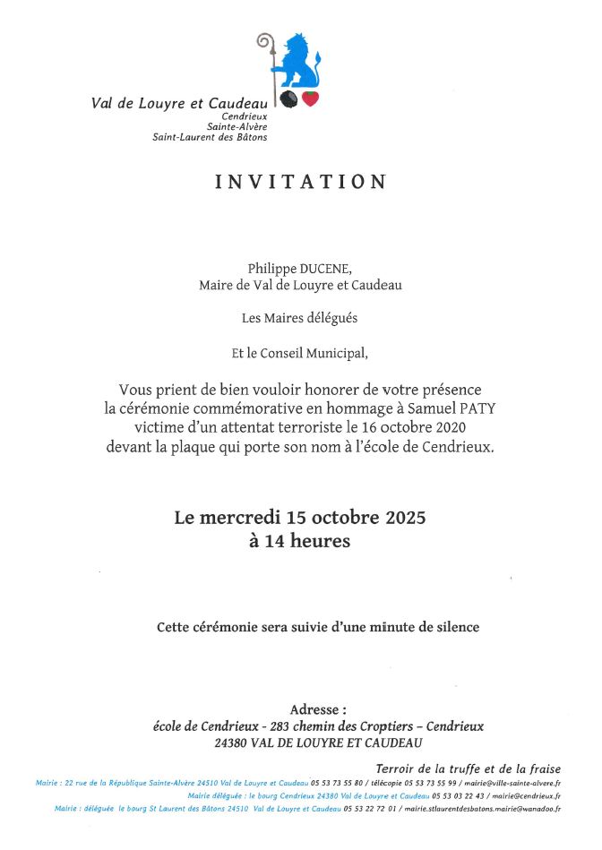 Cérémonie commémorative en hommage à Samuel PATY le mercredi 15 octobre 2025 à 14 heures à l’école primaire de Cendrieux.
