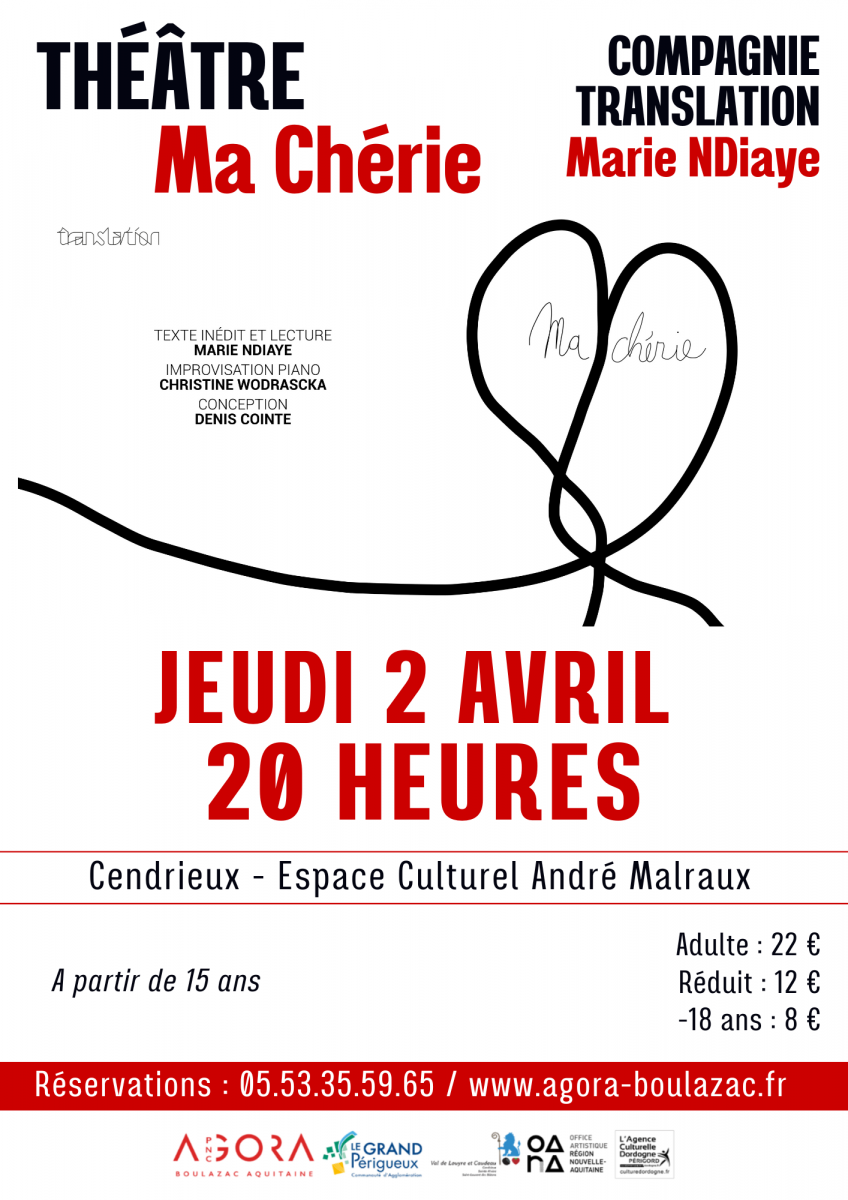 Réservation en ligne : https://billetterie-agoraboulazac.mapado.com/event/579706-ma-cherie-compagnie-translation-marie-ndiaye