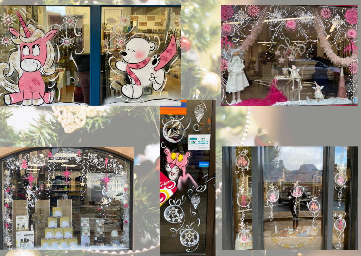 Les vitrines des commerces et de l'office du tourisme de Sainte-Alvère décorées pour Noël.