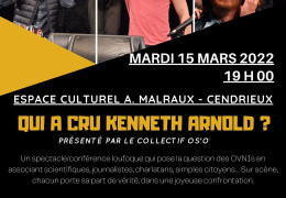 Mardi 15 mars - 19 heures Théâtre à l'espace culturel Malraux à Cendrieux. " Qui a cru Kenneth Arnold ? " Présenté par le Collectif Os'o. En collaboration avec le PNC Agora de Boulazac Spectacle présenté sous la forme d'une conférence loufoque. Le sujet n'en est pas moins d'actualités. Nous parlons