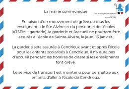 Ecoles – Grève du 13 janvier 2022 La mairie communique En raison d’un mouvement de grève de tous les enseignants de Ste Alvère et du personnel des écoles (ATSEM – garderie), la garderie et l’accueil ne pourront être assurés à l’école de Sainte-Alvère, le jeudi 13 janvier. La garderie sera assurée à