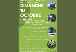 Dimanche 10 octobre, dans le cadre de la semaine développement durable Randonnées "Nettoyons notre nature, préservons notre environnement" Au départ de Saint-Laurent des Bâtons. Circuits entre 3 et 8 kms, adaptés aux familles (environ 2 heures) RDV 9h30 à la salle de convivialité de St Laurent des