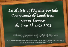 La Mairie de Cendrieux et l'Agence Postale Communale de Cendrieux seront fermées du 9 au 22 août 2021. Réouverture de la Mairie de Cendrieux le lundi 23 août après-midi. Réouvertue de l'Agence Postale Communale le mardi 24 août au matin.