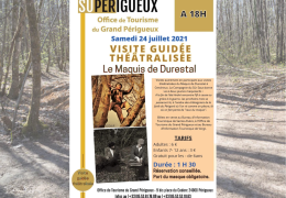Samedi 24 Juillet à 18H00 Visite Guidée Théâtralisée du Maquis de Durestal Durée 1H30 Tarifs: Adultes 6 euros Enfants 7-12 ans 3 euros Réservation conseillée, port du masque obligatoire. Billets en vente au Bureau d'information Touristique de Sainte-Alvère, à l'Office de Tourisme du Grand Périgueux