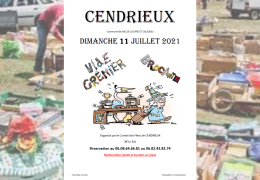Dimanche 11 Juillet Vide-Grenier à Cendrieux organisé par le Comité des Fêtes de Cendrieux. 2 euros le mètre linéaire Réservation au: 06.08.64.66.81 ou 06.82.43.82.74 Restauration et buvette sur place