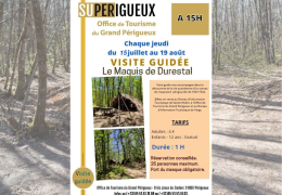 Chaque jeudi du 15 juillet au 19 août visite guidée du Maquis de Durestal Rendez-vous sur place. Durée de la visite 1 heure Tarif : 4 euros ( gratuit pour les moins de 12 ans) Billets en vente au Bureau d'Information touristique de Sainte-Alvère. Réservation conseillée au 05.53.61.76.99 25 personnes