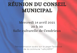 Réunion du Conseil Municipal le mercredi 14 avril 2021, à 20h30 à la salle culturelle André Malraux (Cendrieux). Cette réunion se tiendra dans le respect des consignes particulières édictées dans le cadre du COVID19 : organisation, gestes barrières, règles sanitaires, port du masque… La séance sera