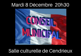 Réunion du Conseil Municipal le Mardi 8 Décembre 2020, à 20h30 à la salle culturelle André Malraux (Cendrieux). Cette réunion se tiendra dans le respect des consignes particulières édictées dans le cadre du COVID19 : organisation, gestes barrières, règles sanitaires, port du masque… La séance est