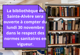 La bibliothèque de Sainte-Alvère sera de nouveau ouverte au public à partir de lundi 30 novembre dans le respect des normes sanitaires en vigueur.
