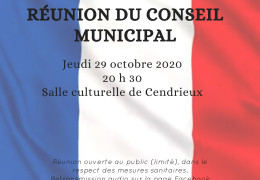 Le Conseil Municipal se réunira à la salle culturelle André Malraux “Les Sablettes” à Cendrieux (commune de Val de Louyre et Caudeau) : le jeudi 29 octobre 2020, à 20h30. Cette réunion se tiendra dans le respect des consignes particulières édictées dans le cadre du COVID19 : organisation, gestes