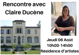 Portes ouvertes à la résidence d'artistes jeudi 06 Août de 10h00 à 14h00 Venez rencontrer Claire Ducène et découvrir son travail autour d'un café! Au vu de la situation sanitaire, port du masque obligatoire et respect des gestes barrières. Pour en savoir plus sur le travail de Claire n'hésitez pas à