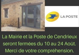 La Mairie et la Poste de Cendrieux seront fermées du 10 au 24 Août. Pour vos démarches, vous pouvez vous adresser à la Mairie de Sainte-Alvère ainsi qu'au bureau de poste de Sainte-Alvère.