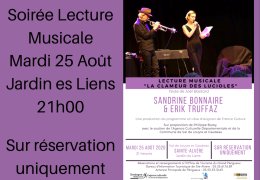 Mardi 25 Août à 21h00 au Jardin es Liens de Sainte-Alvère Soirée Lecture Musicale :"La clameur des lucioles" Avec Sandrine Bonaire et Erik Truffaz sur un texte de Joël Bastard. Sur réservation uniquement, nombre de places limité. Bureau d'information Touristique de Ste Alvère: 05.53.61.76.89 Antenne