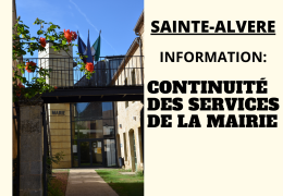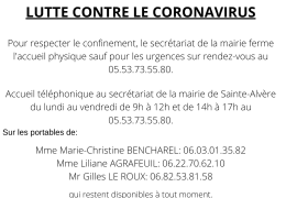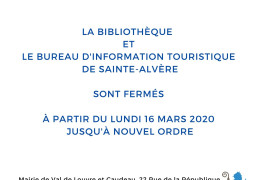 En vertu des annonces gouvernementales, la Mairie de Sainte-Alvère met en oeuvre un plan de continuité des services. Aussi, l'accueil physique du public est maintenu uniquement pour les urgences aux horaires habituels d'ouverture et dans le respect des normes de protection sanitaire. L'accueil