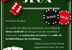 Pour la deuxième saison, tous les troisièmes vendredis du mois, le Comité des fêtes de Cendrieux vous attend à la bibliothèque de Cendrieux, pour une soirée autour de jeux de société ou de cartes.