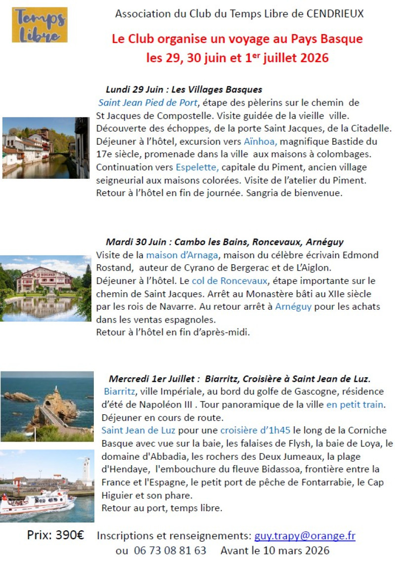 Le Club vous propose un voyage au Pays Basque fin juin - inscription avant le 10 mars.